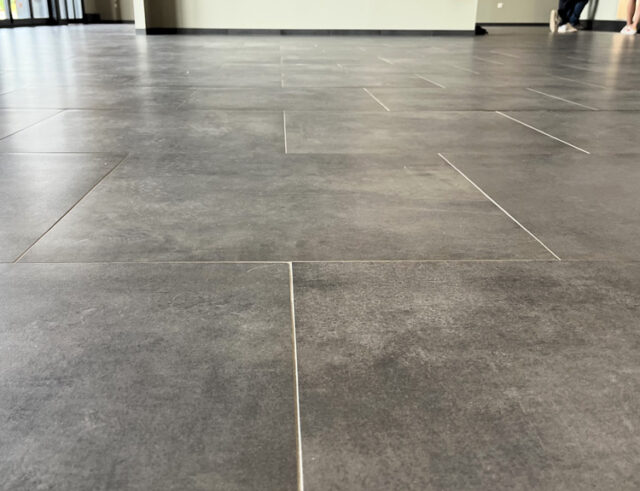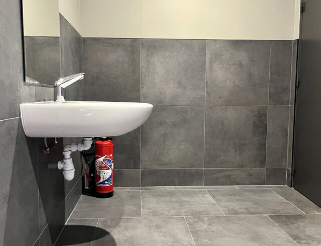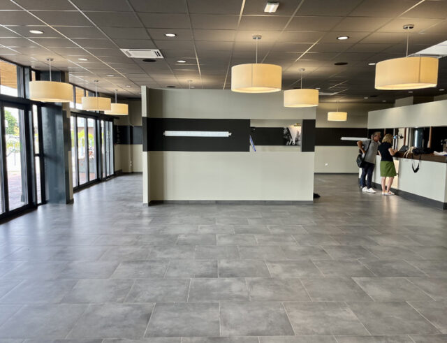 Rénovation d’un restaurant Bistrot Régent à L’Isle Jourdain (32). Pose en décalé dans la salle de restauration et sanitaire. Réalisation des faiences dans les sanitaires.
