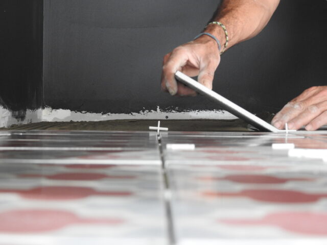 Aménagement d’une boutique dans une boucherie. Pose de carreaux de ciment et de carreau au format 60x60cm.