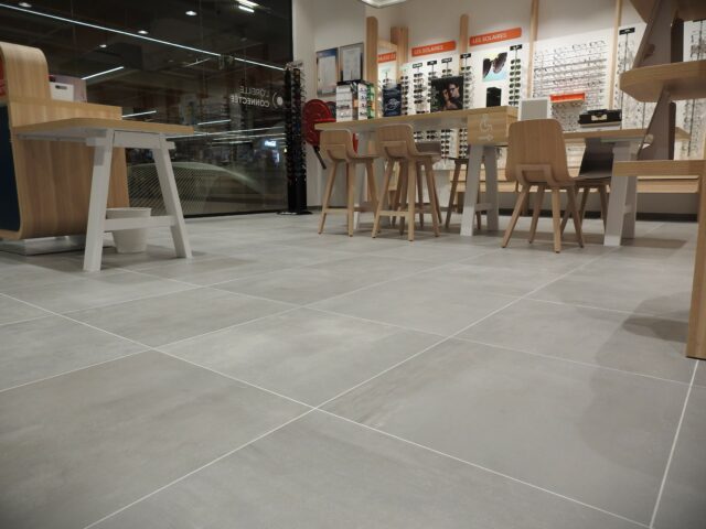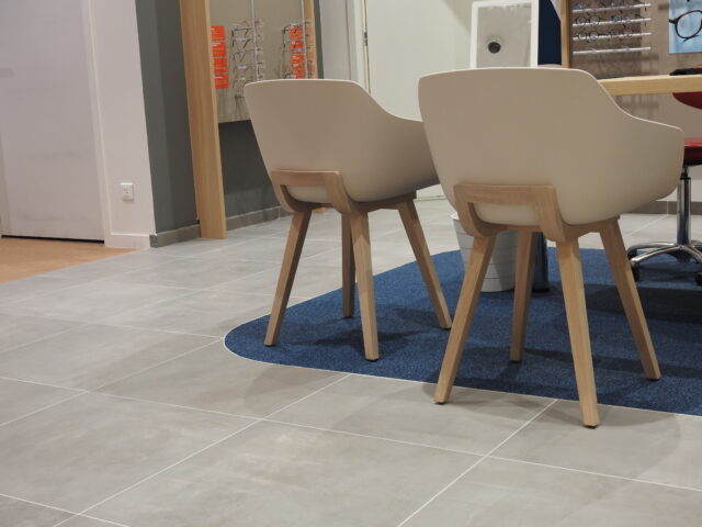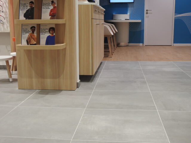 Travaux de carrelage et de sol souple pour la création d’un centre d’optique avec pose de tapis de sol.